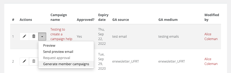 - Once you are happy with the campaign template and it is approved, you can then follow the guide to sending a campaign to complete the process. The option to generate a member campaign will be available from the record action once it is approved;