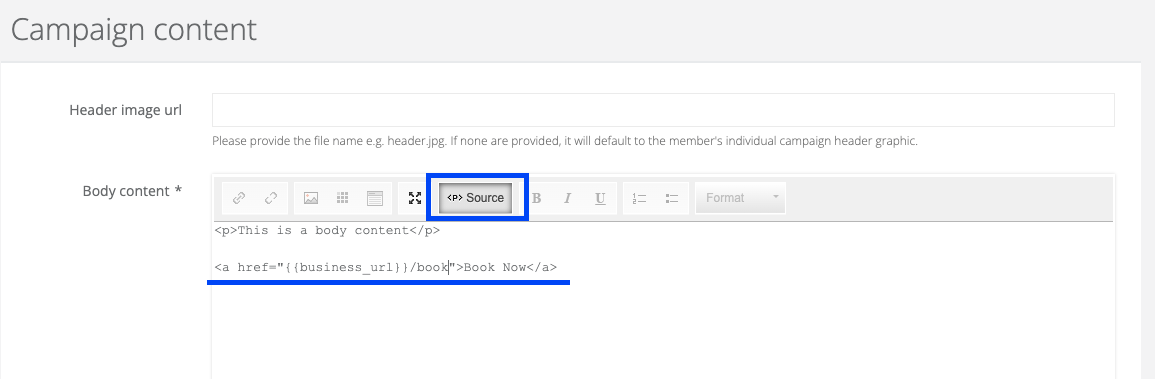 <p>Sourcebutton, you will go into the HTML edit mode. insert the link by placing thehrefattribute of an anchor tag<a>. Please referred to the format above in the Implementation Example.