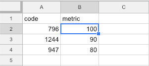The first row will contain the CSV headers: code and metric.