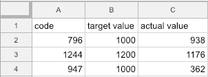 The first row will contain the CSV headers: code and target value and actual value.