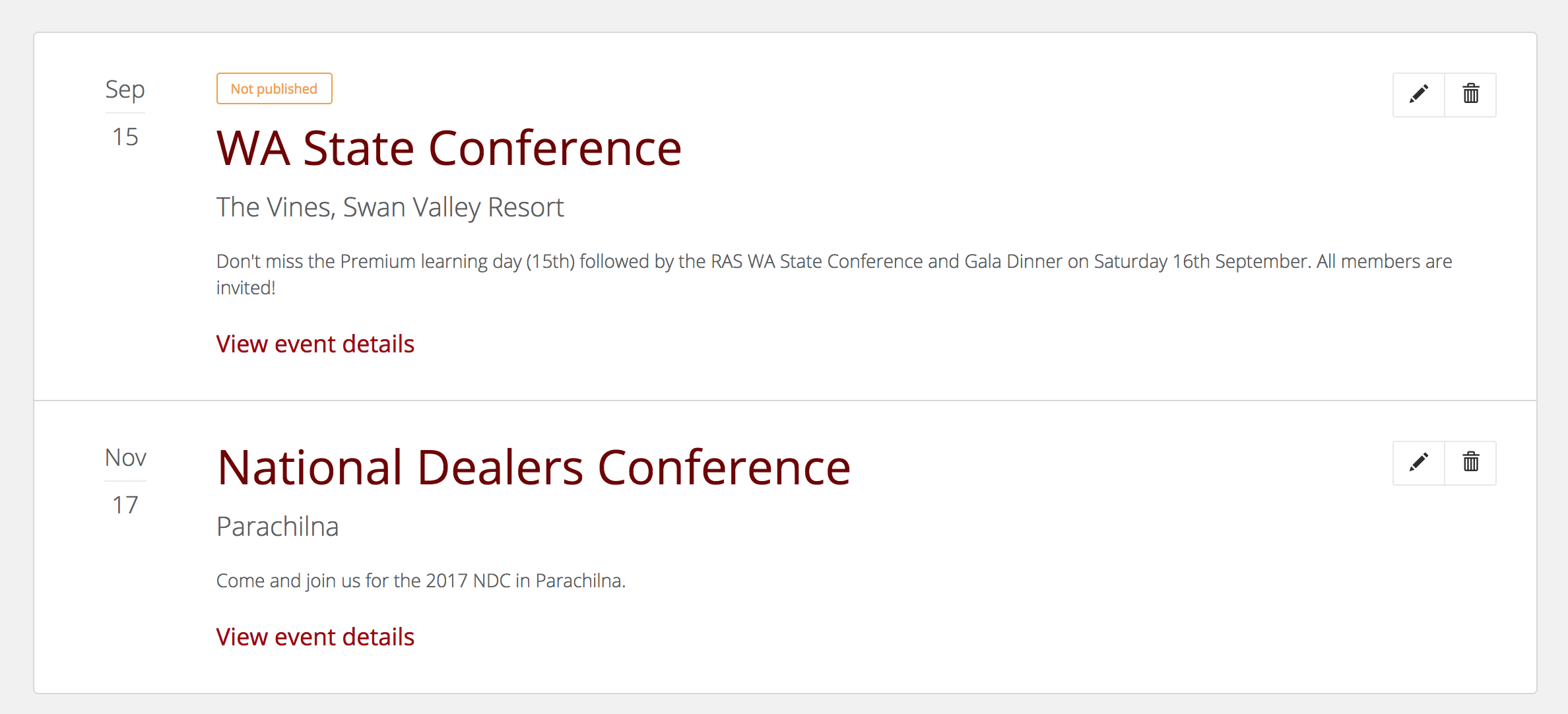- Preview the event using the view event details link on the index page.