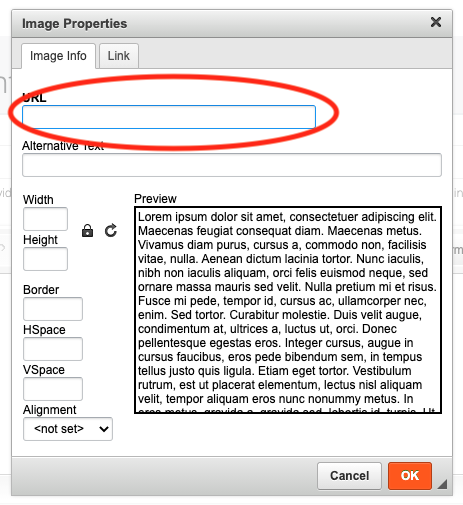 - In the Image Properties popup, enter the URL of the image you uploaded to AWS (making sure it starts with https://)